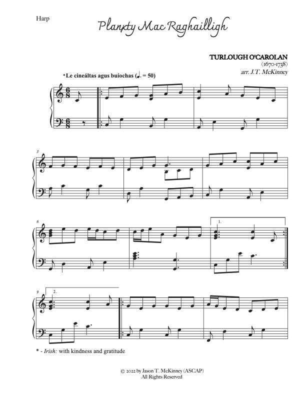 Arranged by J.T. McKinney, two selections for solo harp from the collected tunes of Turlough O'Carolan (1670-1738), Ireland's last great bard.